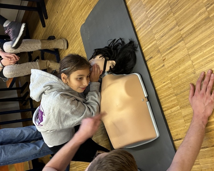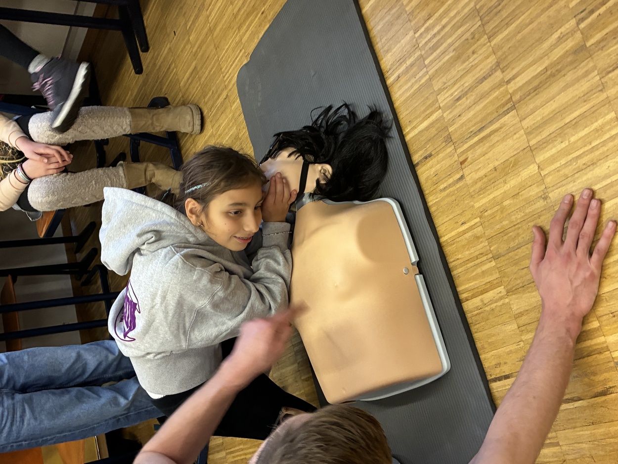 Am Mittwoch, vor Beginn der Weihnachtsferien, fand ein Reanimationstraining für die Klassen 5a, 6a, 7b, 8a und 9b statt. Frau Dr. Petra Hederer vom Notfallzentrum der Uniklinik Freiburg und ihr Team leiteten die Schülerinnen in der Herangehensweise einer Notfallsituation an. Die Klassen übten die stabile Seitenlage und lernten die so genannte „Laienreanimation“ kennen. Dabei geht es darum, Bewusstsein und Atmung zu prüfen, Hilfe zu rufen sowie den Notruf 112 zu wählen und dann ohne Zögern mit der Herzdruckmassage zu beginnen. Die Klassen waren sehr motiviert und konzentriert dabei. Das Lehrerteam war begeistert. Es ist geplant, dass im Verlauf des Schuljahres alle Schulklassen geschult werden. Wir freuen uns schon!Ein Hinweis von Frau Dr. Hederer für alle, die üben möchten: